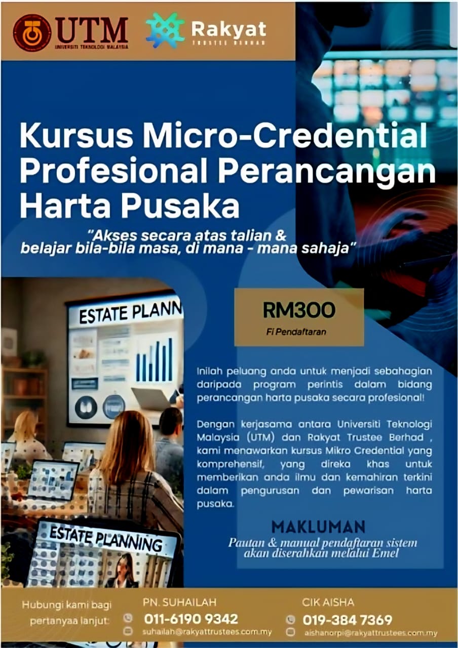 Tingkatkan pengetahuan dan kemahiran anda dalam bidang pengurusan pewarisan harta pusaka melalui Kursus Micro-Credential Profesional yang dirangka khas untuk orang awam, agen, konsultan dan individu yang ingin menjadi pakar yang profesional dalam bidang ini.